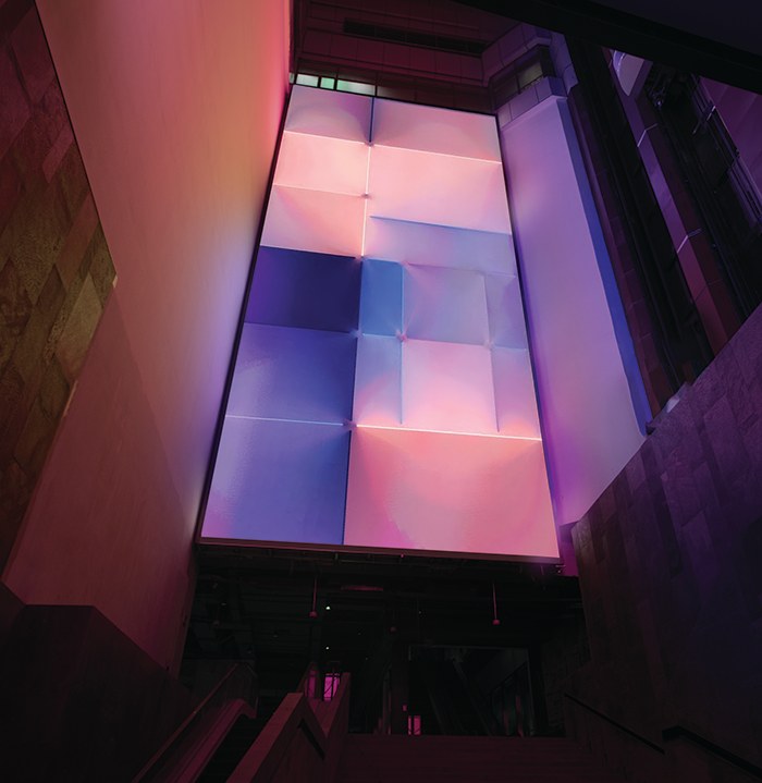 The vivid night mode is visually inspired by urban media facades and colourful neon lights. Thus, the typical hum and buzz of the latter served as inspiration for the material of this mode.