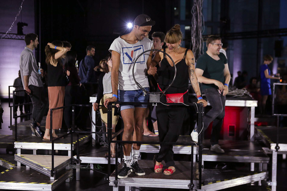 All hardware elements of the installation were integrated into the spatial design, forming the visible “body” of the entity. At the centre, a walk-in stage hosts the interfaces through which visitors shape the 3D soundscape.